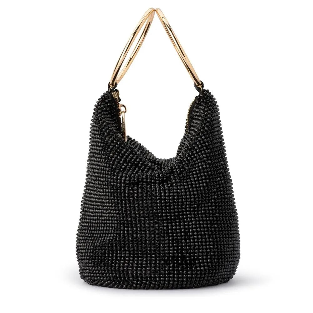 The Ellie Crystal Mesh Ring Handle Bag in black is a blinged-up version of our best-selling Bianca Bag. Featuring a crystal mesh pouch, this ring handle purse is topped with two metal ring handles, just slide them over your wrists like bangles to go hands-free.