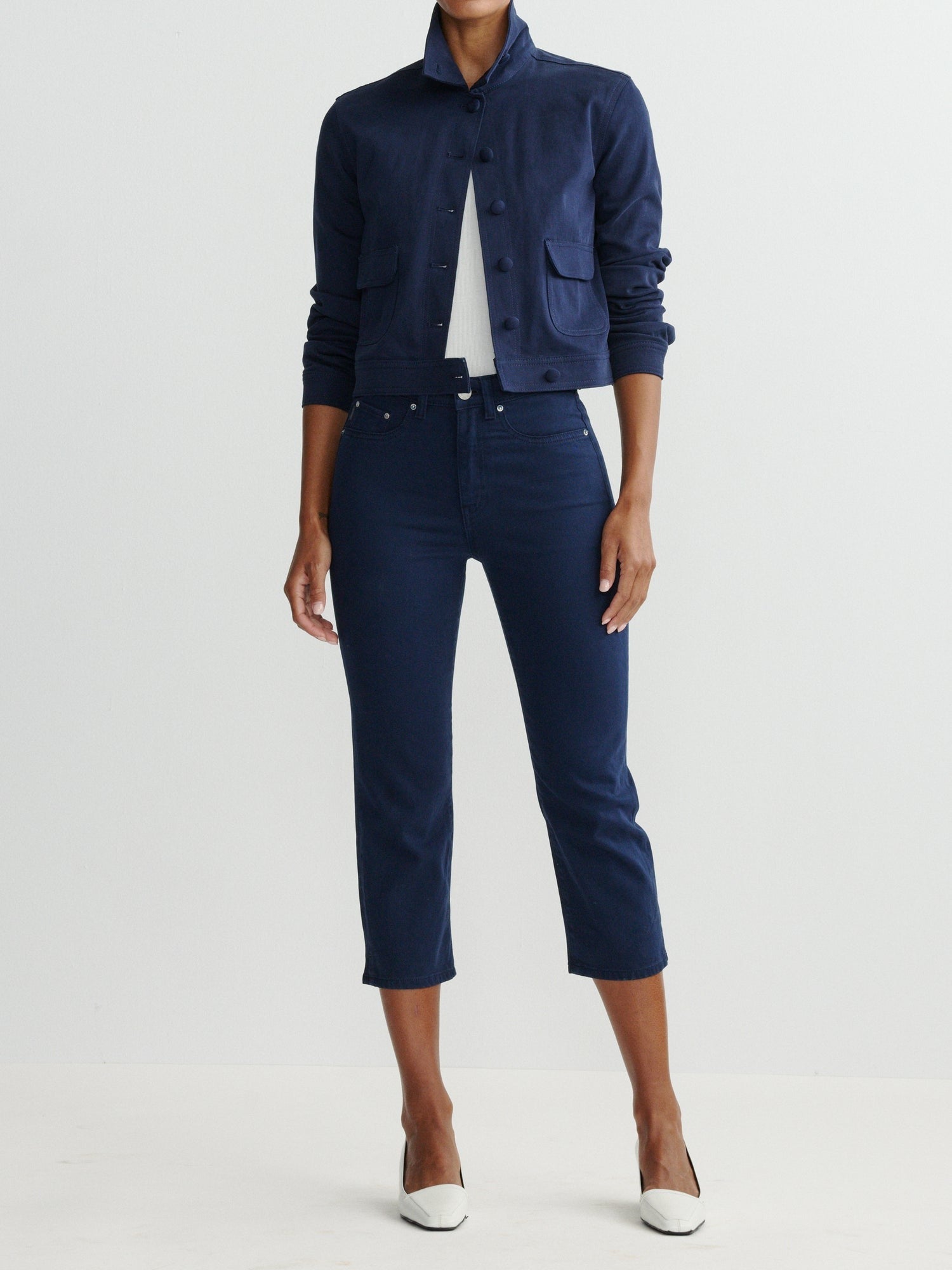 Bright Navy is a vivid, deep blue twill. It features self covered shanks, tonal stitching and a clean hem.
