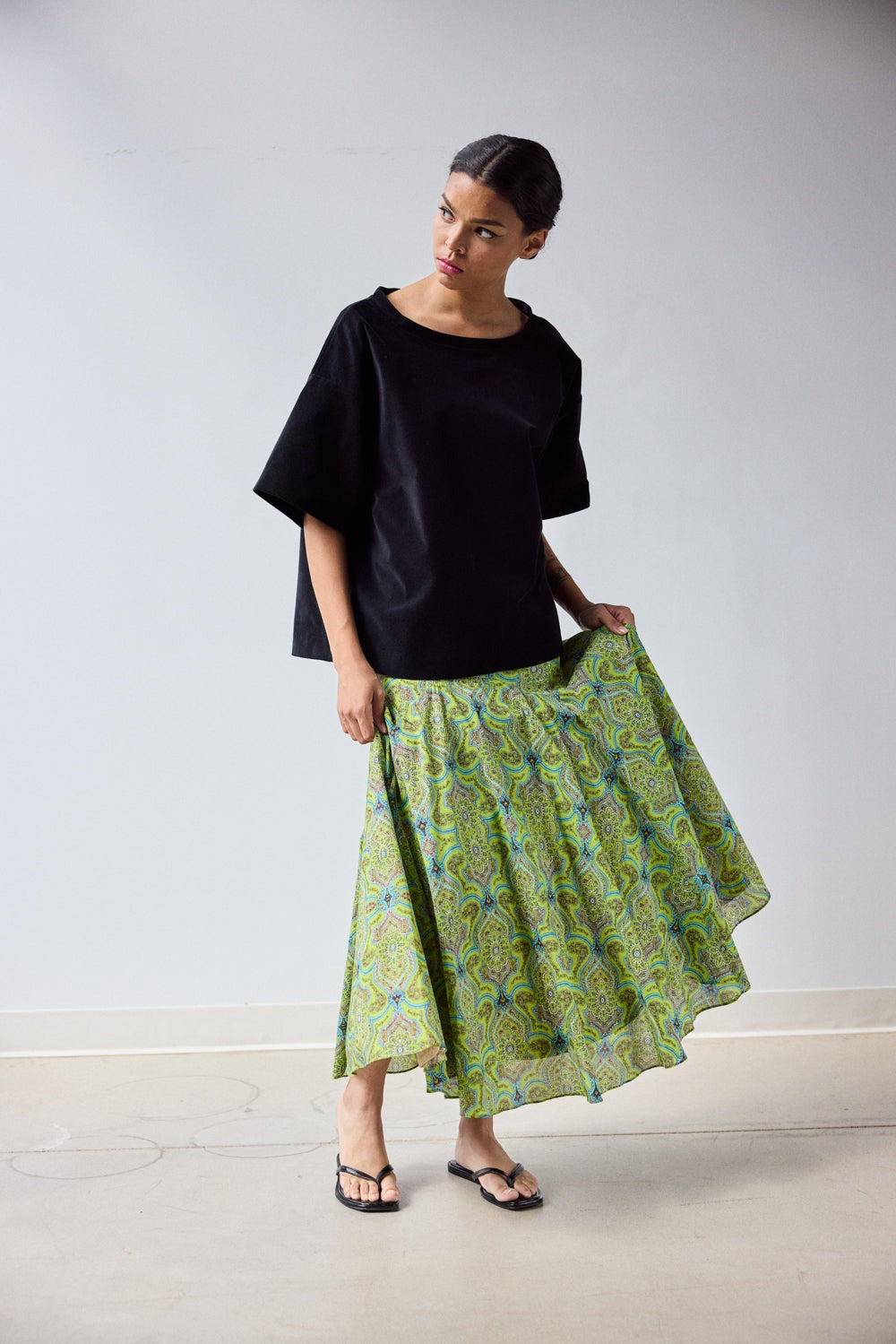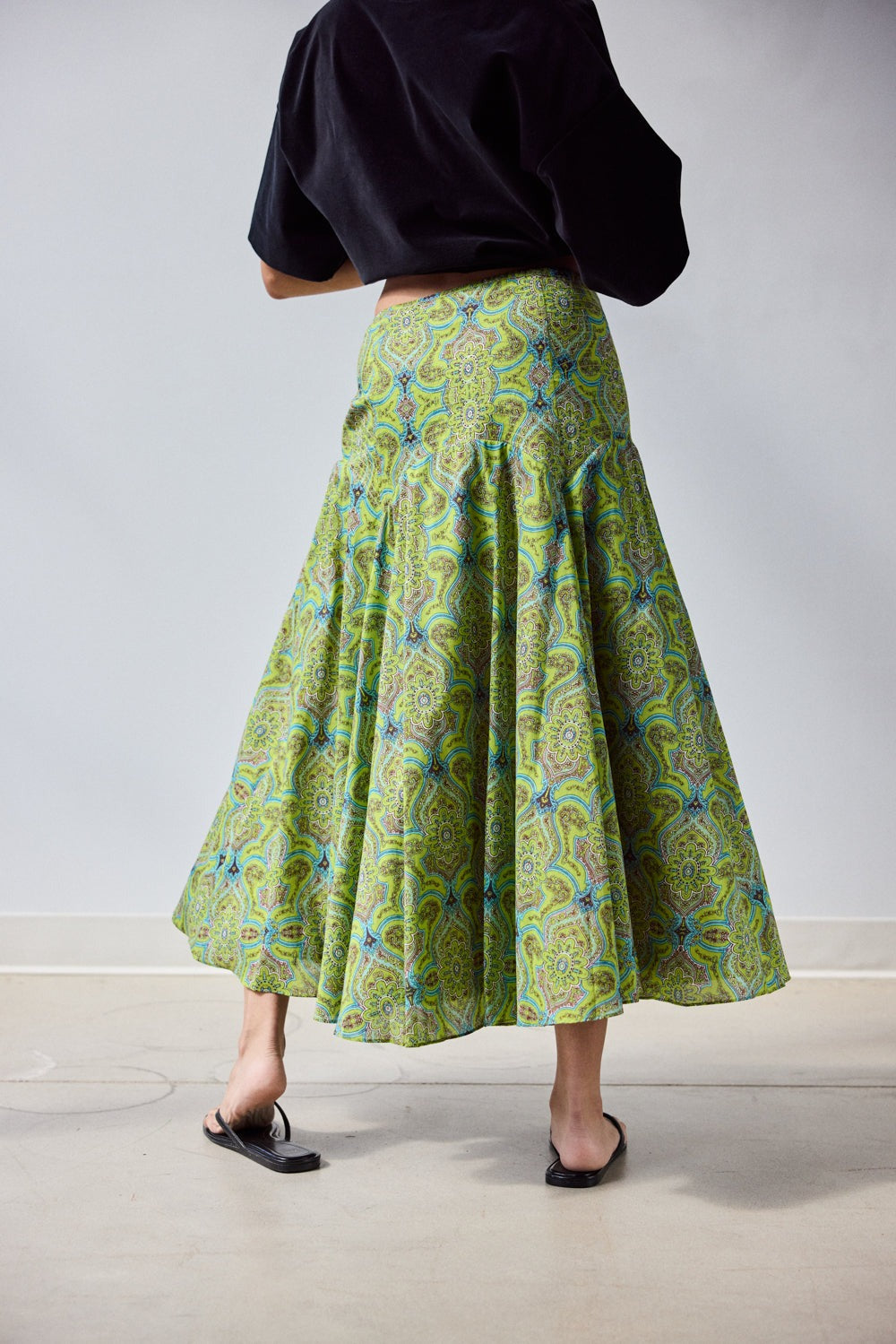 - Circle skirt in double layered Organic Cotton Lawn, with Trapunto and top stitch detailing at curved yoke.