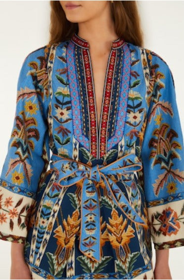 Embrace your bold side in this Farm Rio mini dress, where vibrant embroidered tapestry details meet effortless elegance. The deep V-neckline and flowing full-length sleeves create a striking silhouette, while the self-tie belt lets you cinch and customize your fit. Perfect for turning heads at dinner, brunch, or any occasion calling for a touch of artistic flair and confidence.