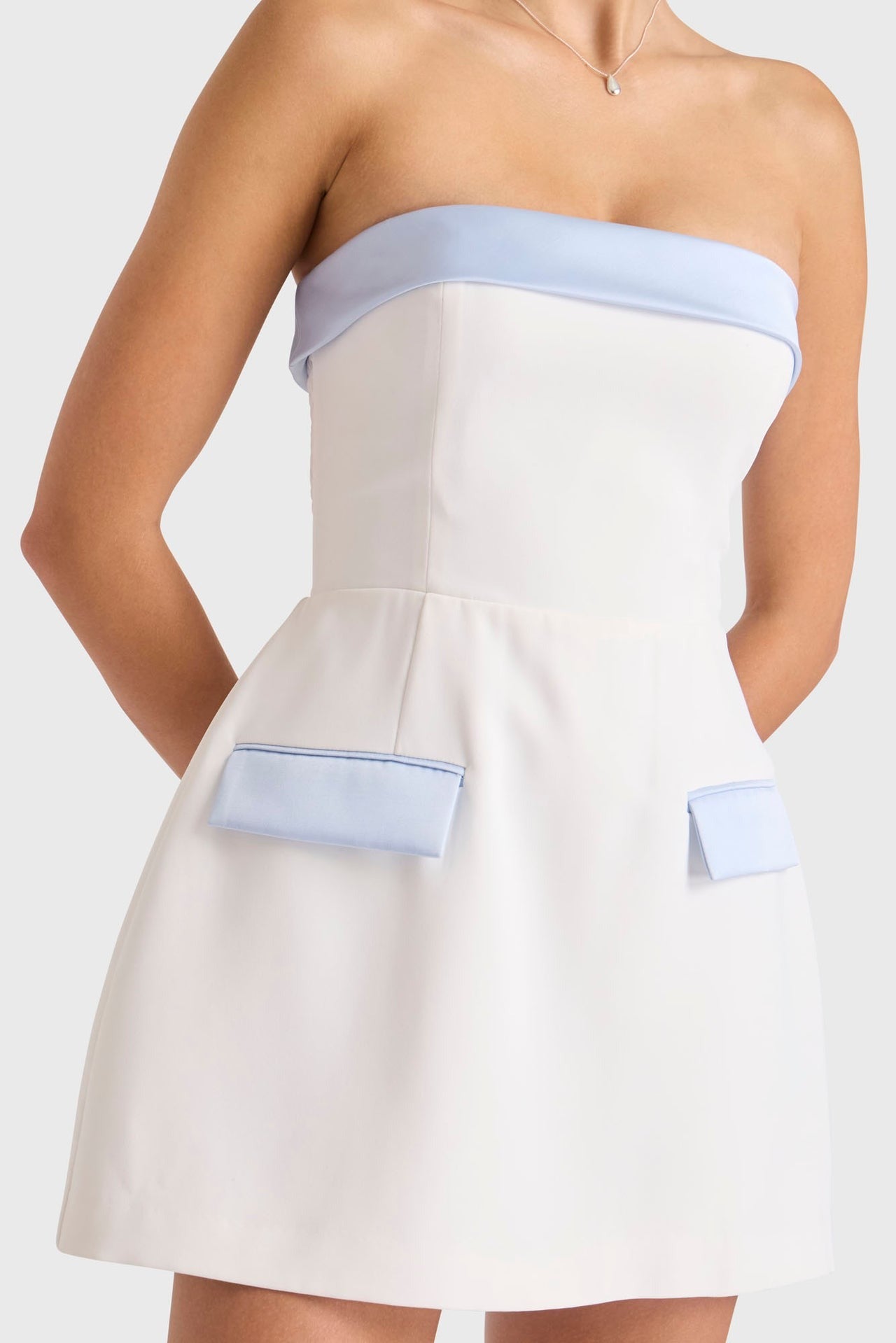 Dress for the occasion with the versatile Lucienne Skort Romper. Made for having fun, this strapless one-piece features charming blue on the neckline and pocket flaps. Style with kitten heels for a fresh and playful look.