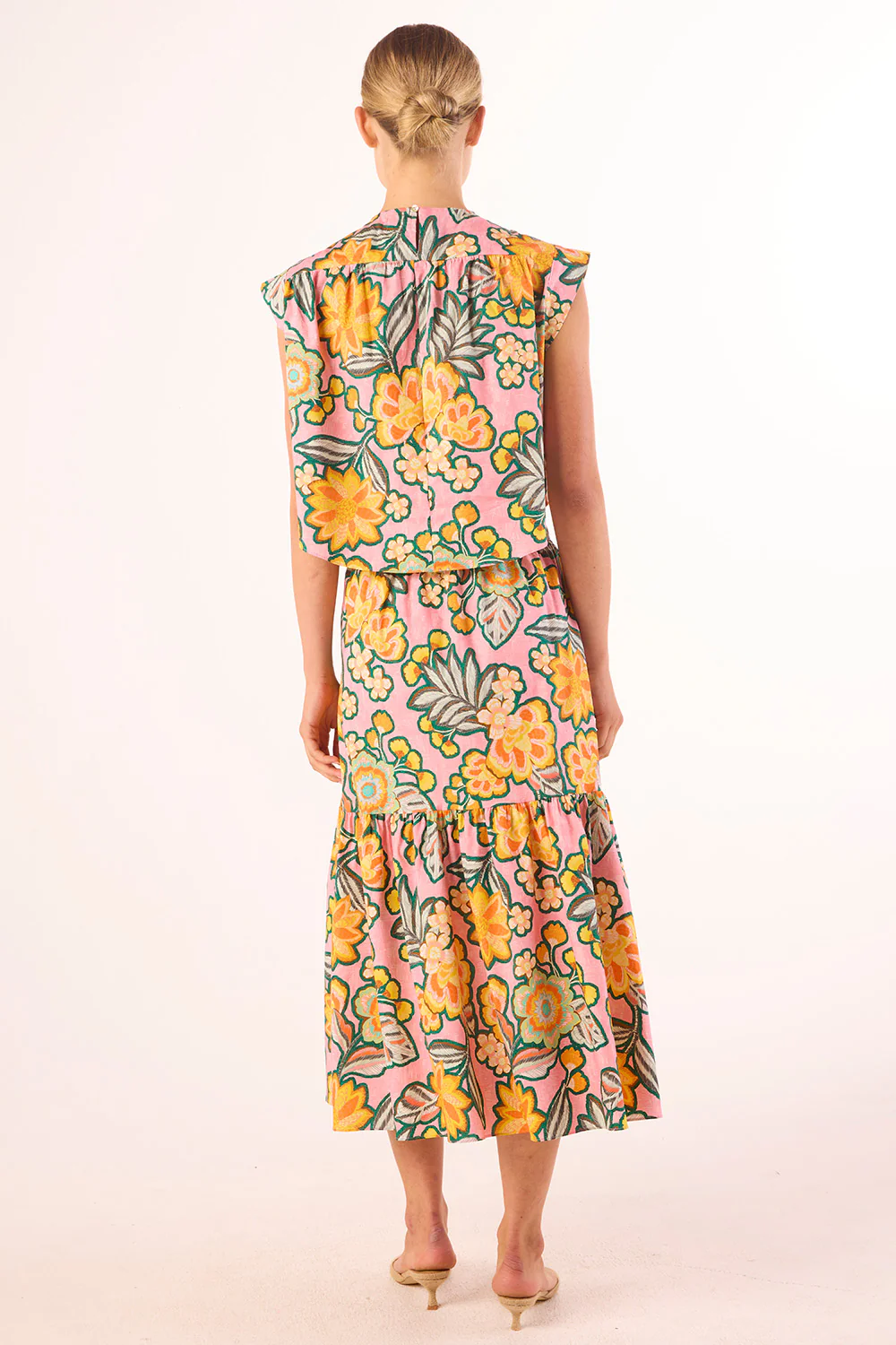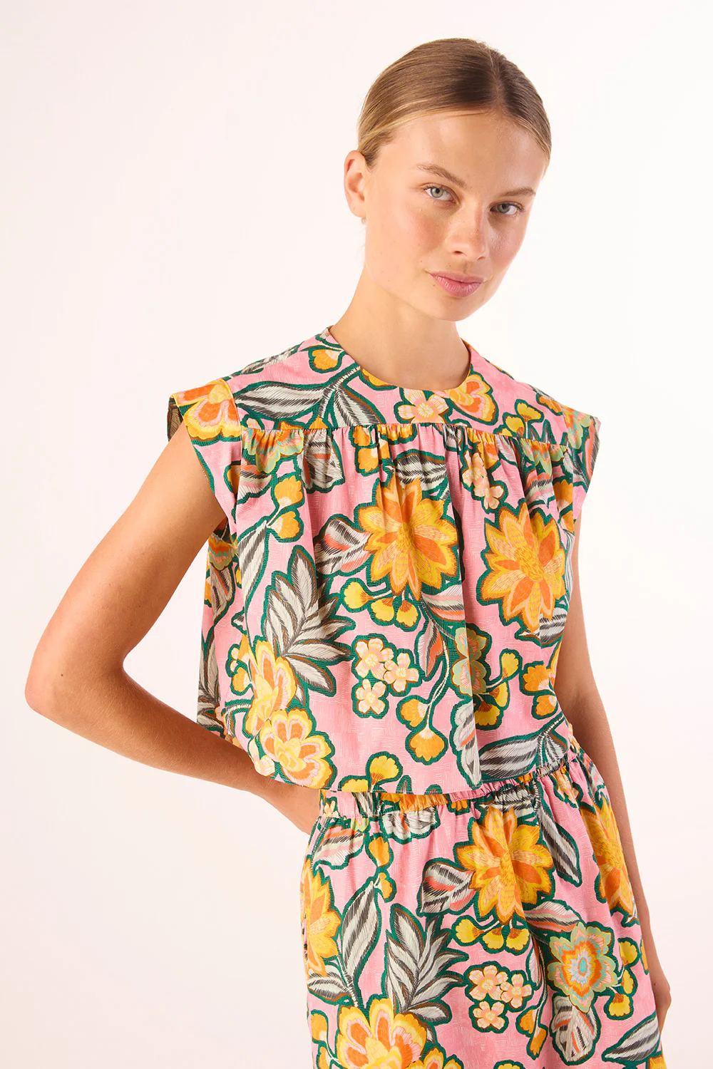 Alina is a cropped top cut from a vibrant desert flower printed cotton poplin. This boxy silhouette features a high neckline, cap sleeves, and a keyhole button closure at the back. A slightly longer back hem adds an easy, relaxed finish. Pair with the coordinating Itzel skirt for a breezy spring set.