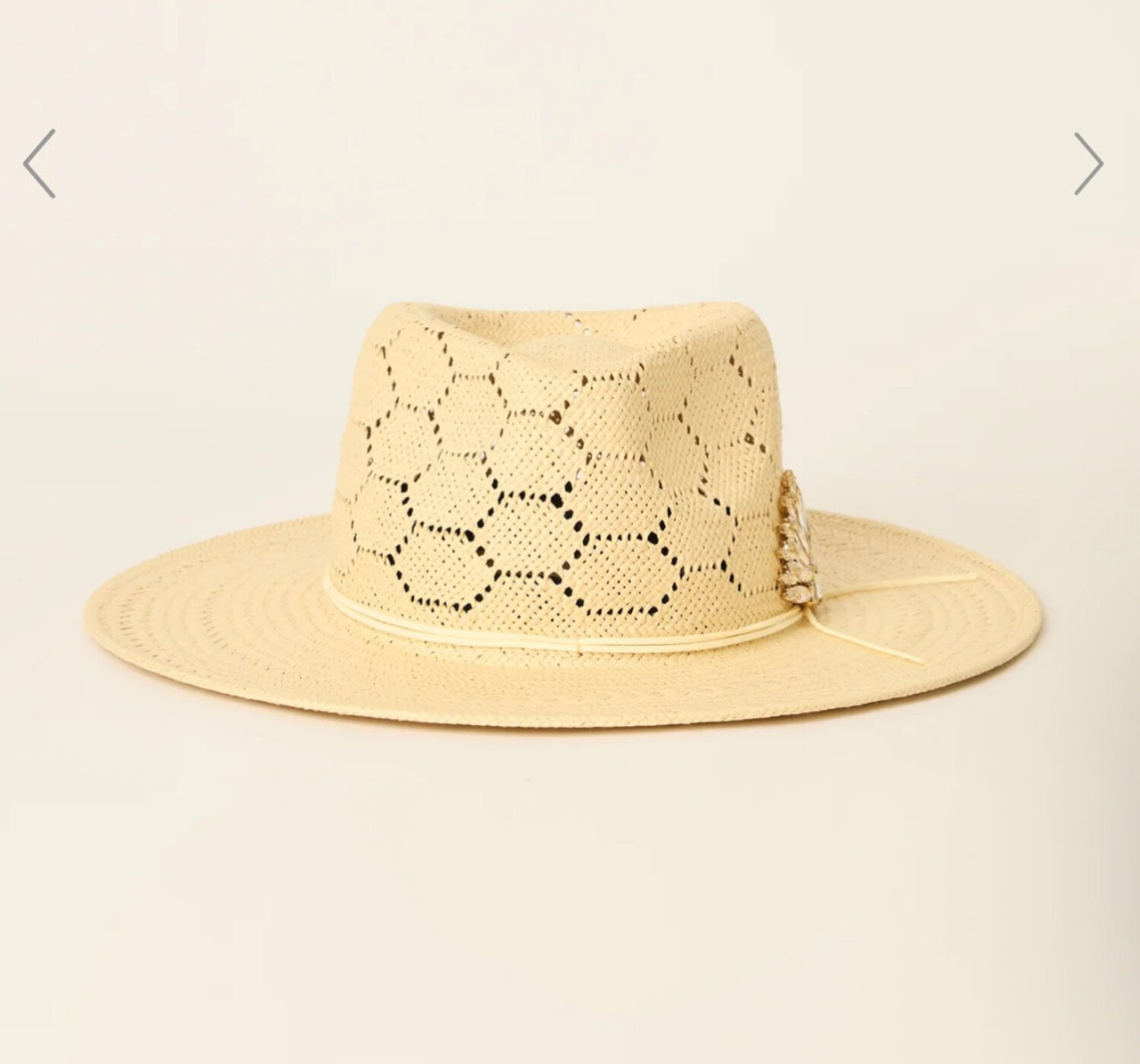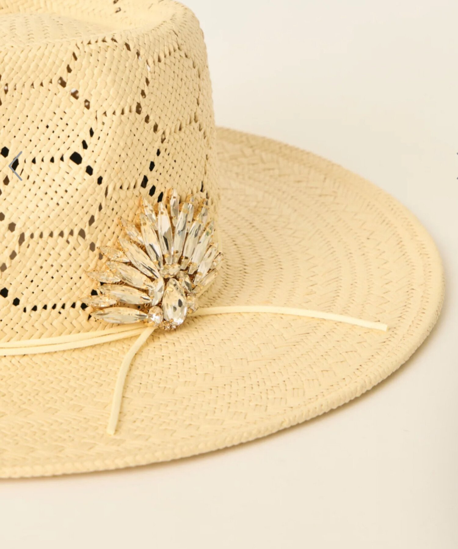 The Bijoux Hat brings a glamorous finish to warm-weather dressing. This statement hat features a structured, wide-brim, airy woven texture, and crystal embellishment detail for a look that feels effortlessly chic. It's the perfect finishing touch for beach clubs, vacation days, and every sun-soaked plan on your calendar.