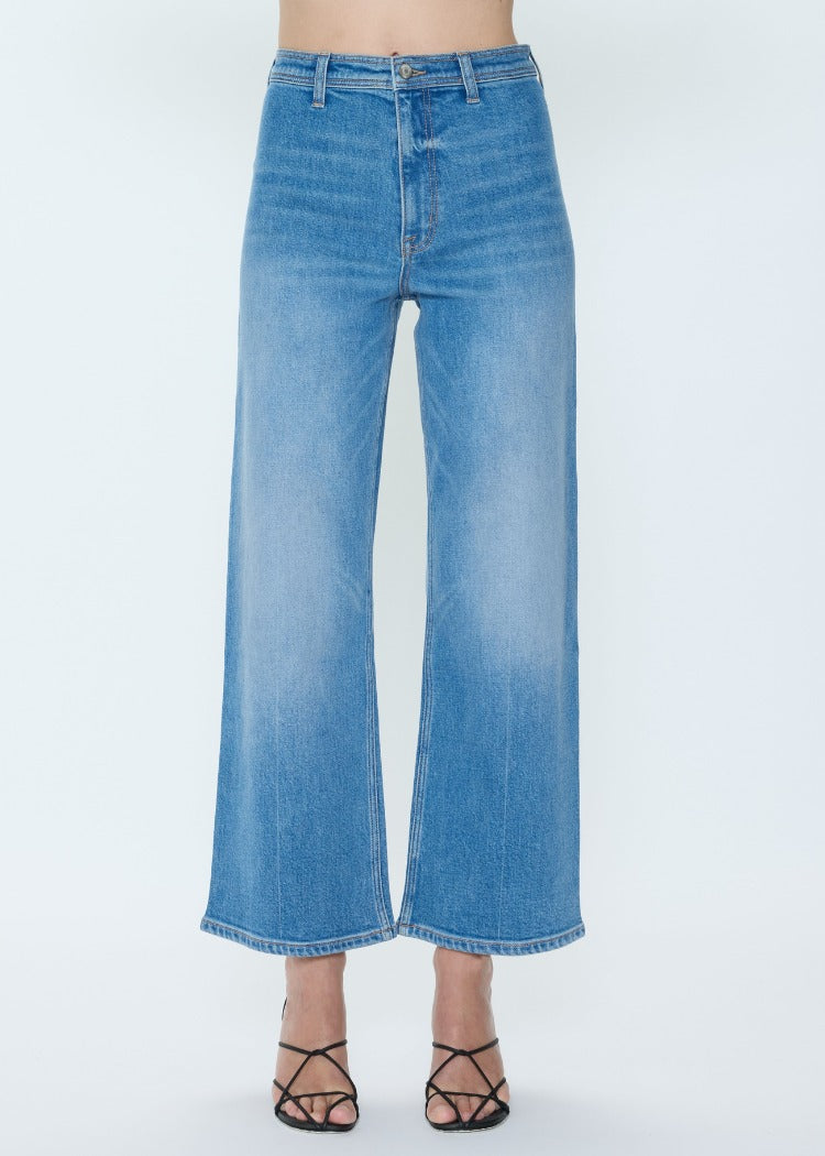 A signature silhouette with timeless appeal, Penny sits high at the waist with an ultra-wide leg and full-length 28" inseam that creates effortless balance and movement. The relaxed shape flows with ease, while the structured rise keeps proportions clean and refined. Crafted from comfort stretch fabric in Solina, a light blue wash with soft fading for an easy, lived-in feel.