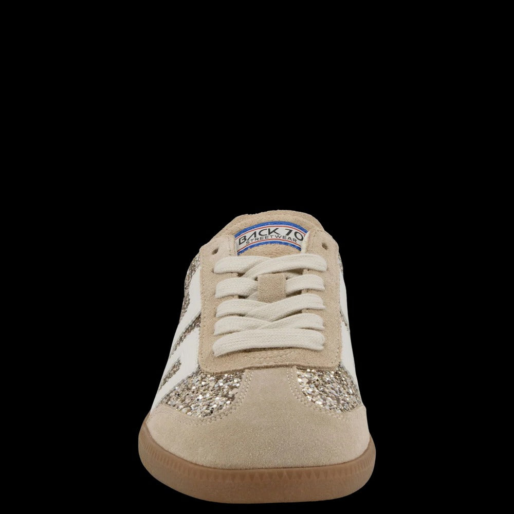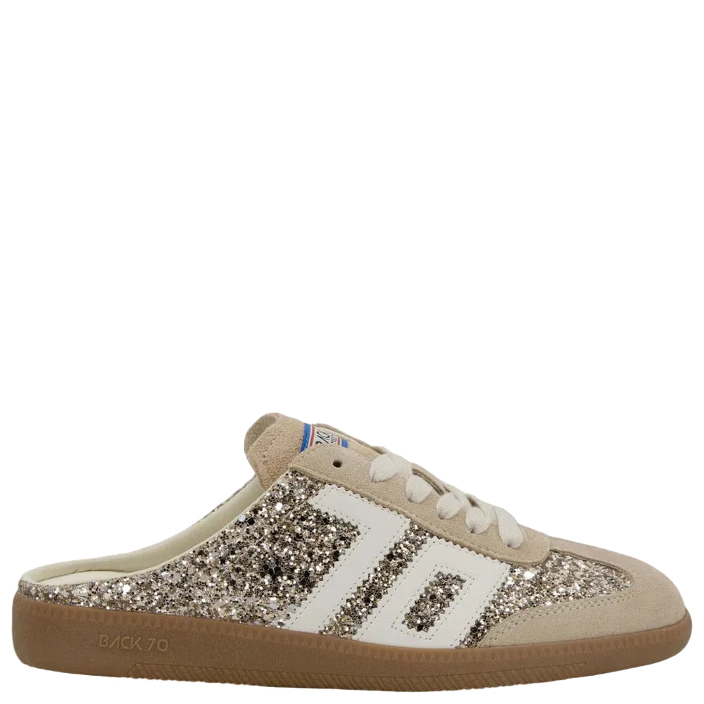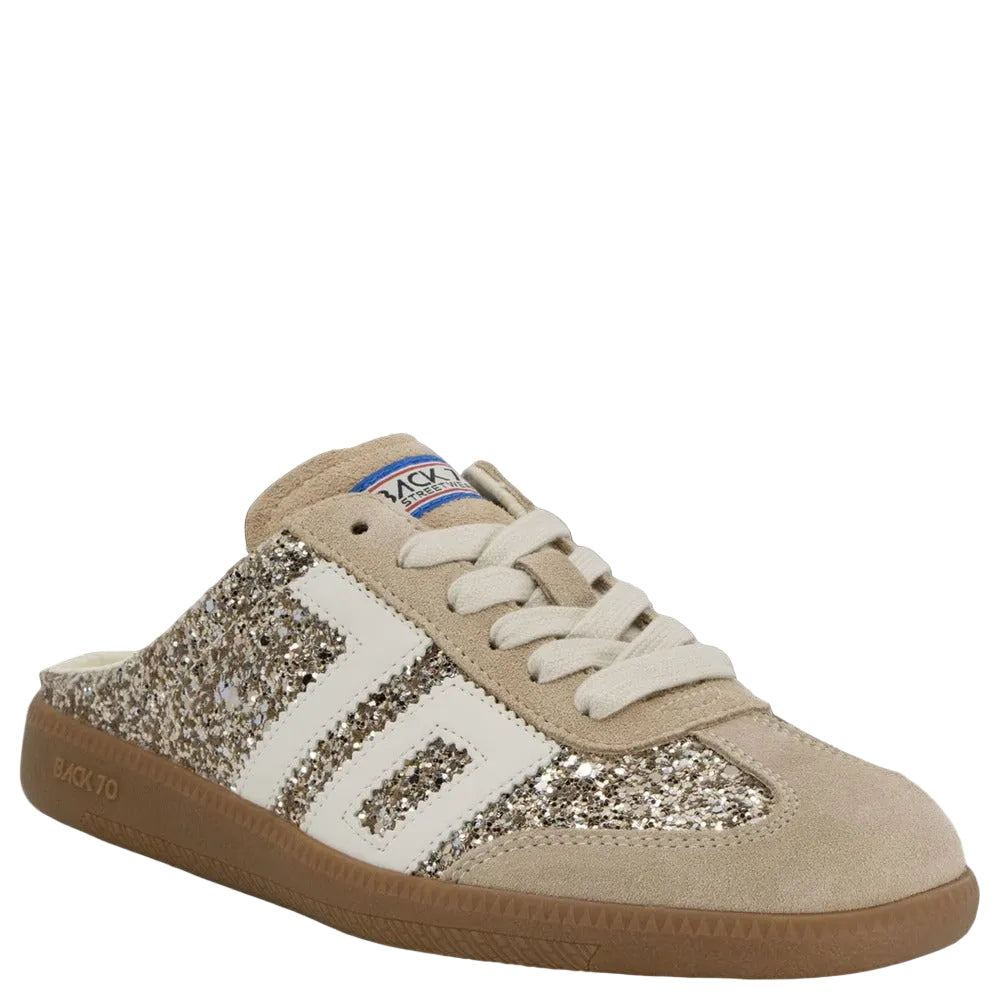 The Back 70 glitter mule brings sparkle to everyday style with a distinctly feminine, boho edge. Designed in shimmering gold glitter, this effortless sneaker mule blends laid-back charm with the brand’s signature vintage detailing. The open-back silhouette adds ease and personality, while subtle suede trims and retro accents keep it unmistakably Back 70. A perfect mix of glamour and casual cool, it’s made for the girlie girl who loves her sneakers with a little shine.