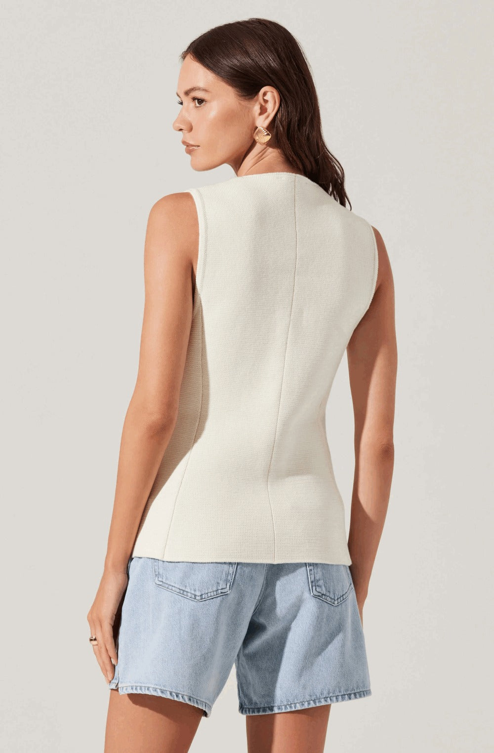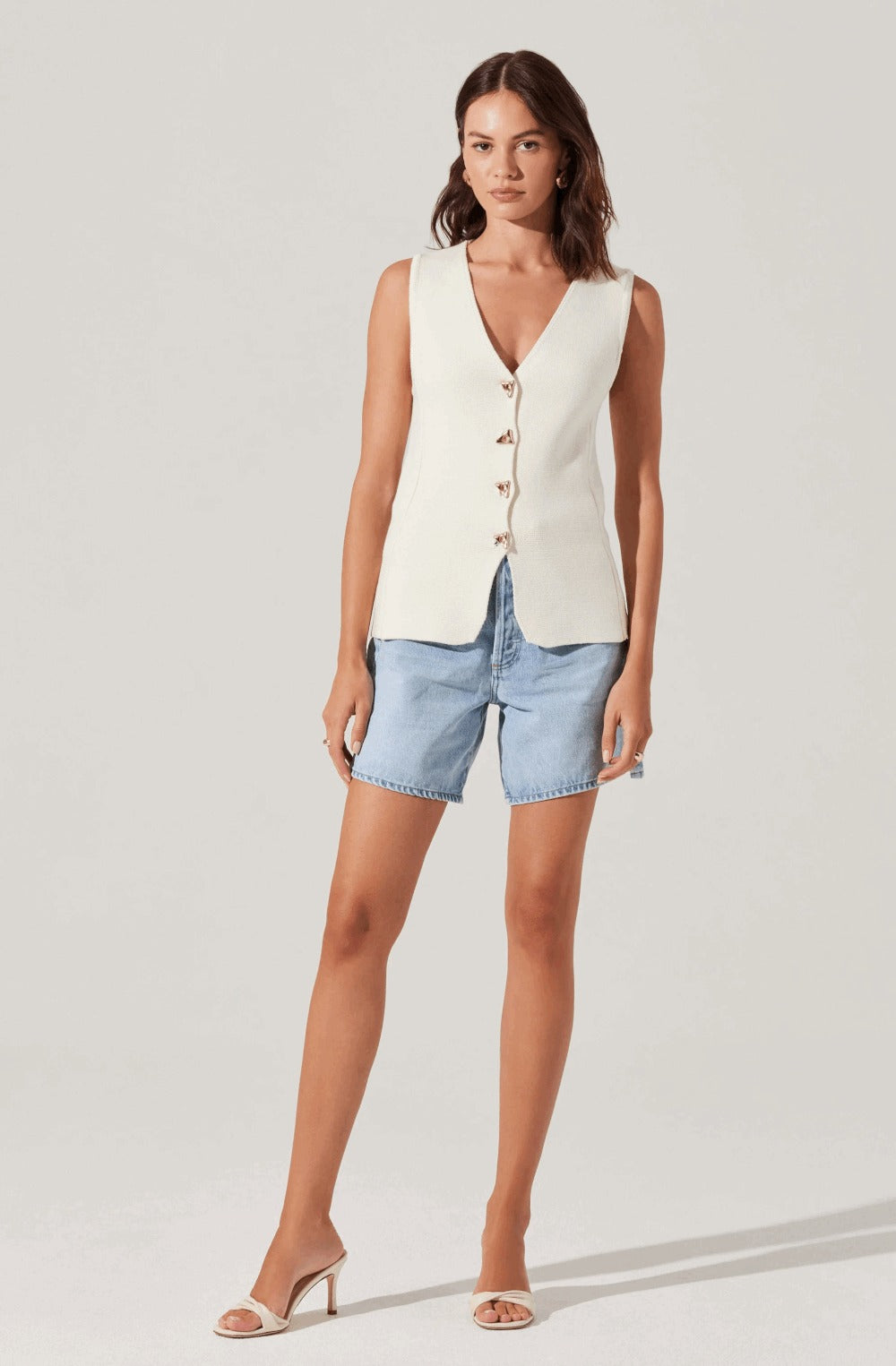 This gorgeous sweater vest has a thick knit and eye-catching gold buttons. It has a structured fit which makes it super flattering. You can wear it casually or dress it up! Pair it with blue denim or go for a monochromatic look instead!
