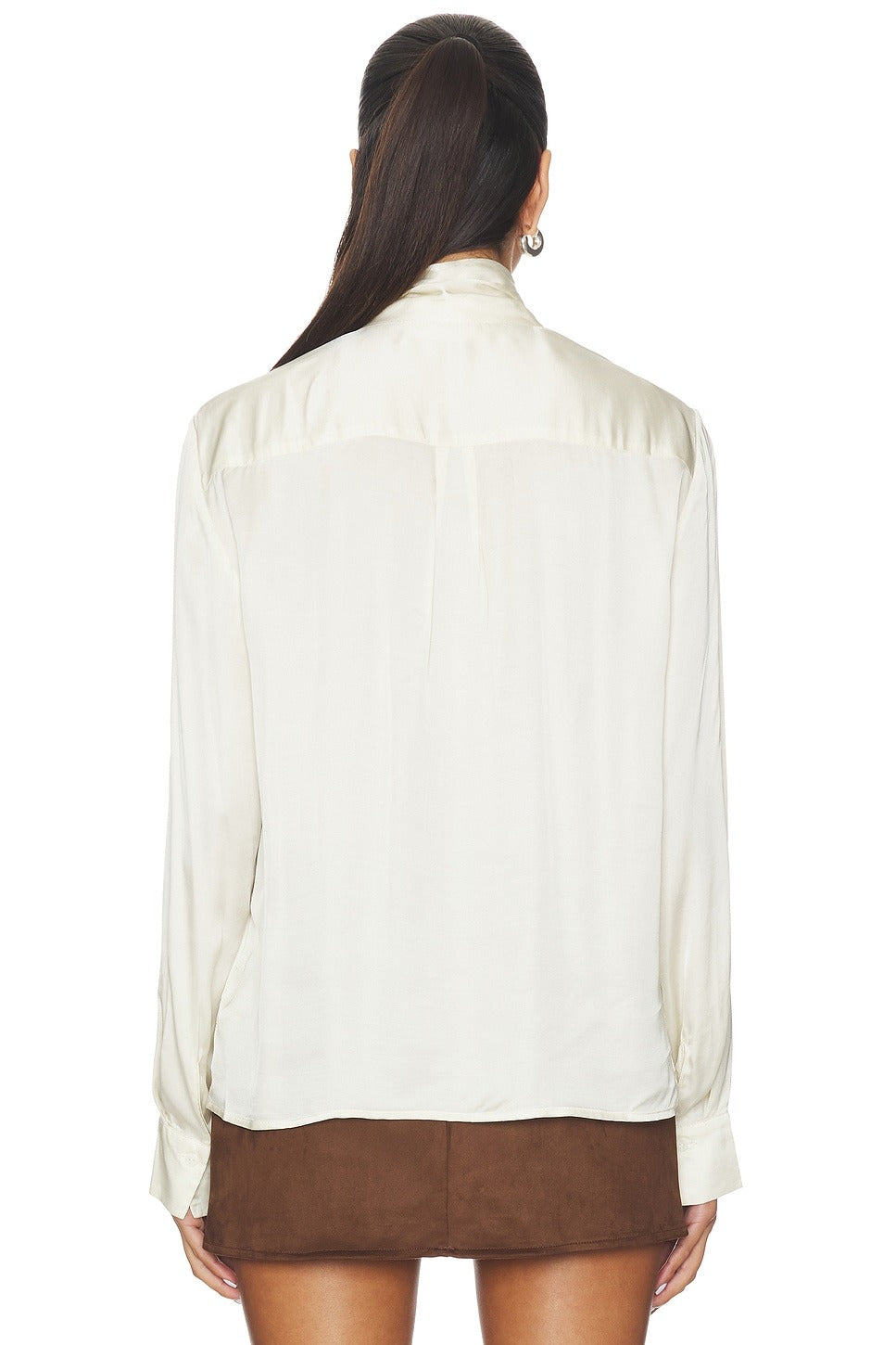 Satin blouse that blends elegance and fun. Featuring a charming tie neck and long sleeves, this cream and white satin top adds a touch of sophistication to any outfit.